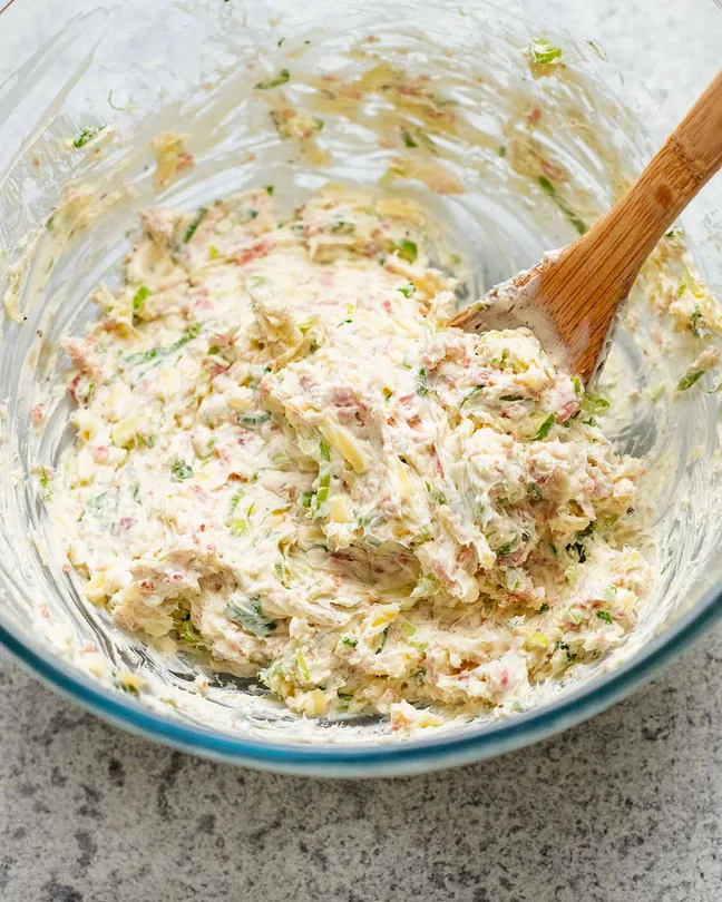 - In a bowl, mix cream cheese, cheddar cheese, mozzarella cheese, garlic powder, onion powder, and a pinch of salt and pepper.